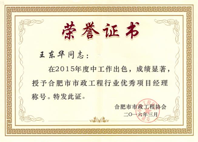 從合肥市市政工程協會召開的第三屆三次理事大會上獲悉,我公司榮獲兩項榮譽,一是企業獲得2015年度合肥市市政工程“優秀企業”稱號,二是我司王東華同志獲得“優秀項目經理”稱號。