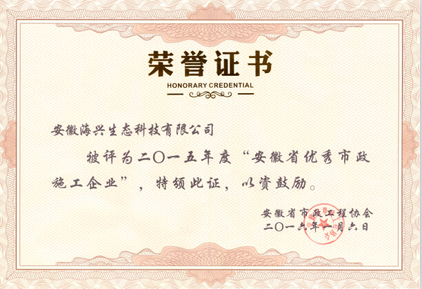 近日,安徽省市政工程協(xié)會(huì)對(duì)2015年度榮獲“安徽省優(yōu)秀市政施工企業(yè)”稱號(hào)的單位進(jìn)行表彰,很榮幸,安徽海興生態(tài)科技有限公司榜上有名。