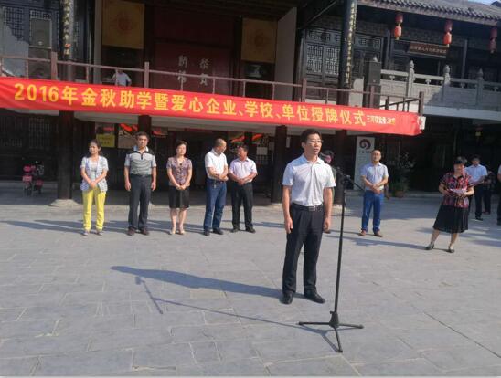 8月29日下午15:00在三河鎮(zhèn)萬年臺廣場舉辦了三河鎮(zhèn)2016年金秋助學(xué)暨愛心企業(yè)、學(xué)校、單位授牌儀式。縣人大、政協(xié)、教育、民政、婦聯(lián)、縣團委等部門的相關(guān)領(lǐng)導(dǎo)出席了儀式,我公司榮獲“愛心企業(yè)”榮譽稱號。
