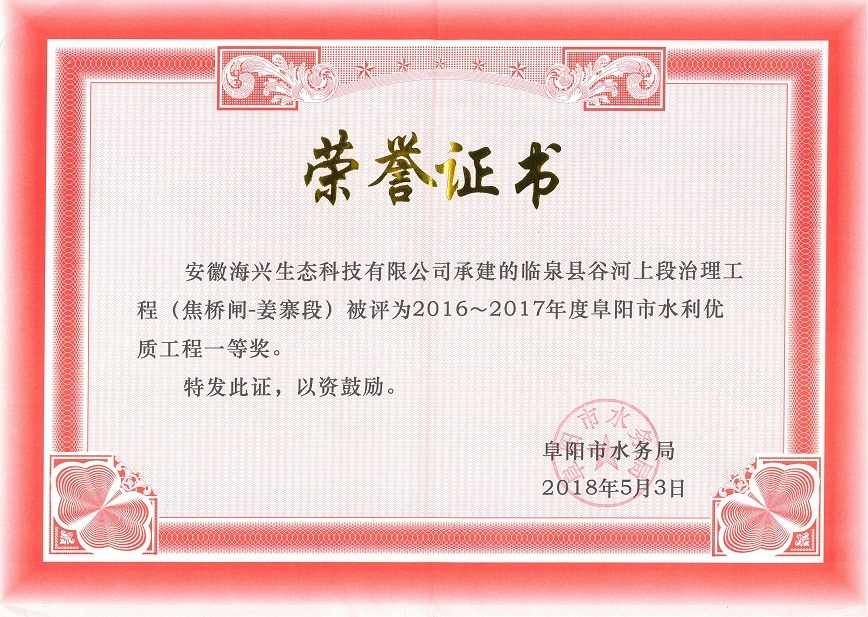 我司承建的臨泉縣谷河上段治理工程(焦橋閘~姜寨段),喜獲了阜陽市2016—2017年度水利施工優(yōu)質(zhì)工程獎——水利基本建設(shè)工程類一等獎,進(jìn)一步提高了公司水利工程的施工管理和技術(shù)水平,為水利工程市場經(jīng)營可持續(xù)發(fā)展創(chuàng)造了更多的機(jī)會和條件。