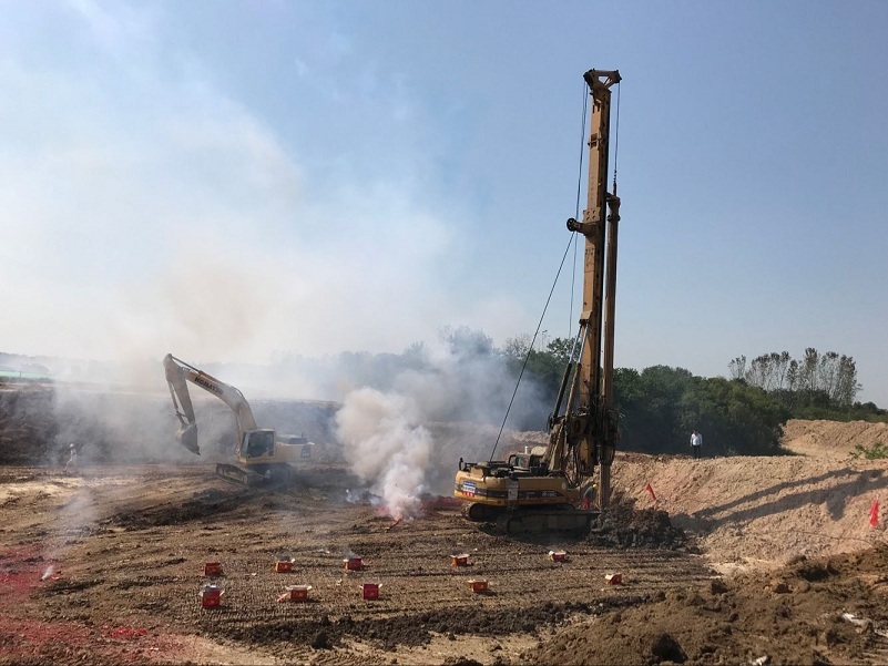 10月3日上午9點16分,國際大道二標(玉蘭大道-三河路)工程施工現場機械攢動,鞭炮齊鳴,伴隨著項目負責人的一聲令下,第一根樁基正式開鉆,拉開了五老堰河3*16m空心板梁橋樁基礎施工的序幕。