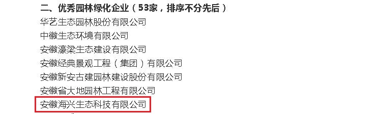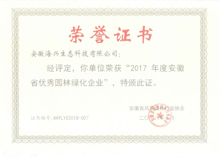 近日,安徽省風景園林行業協會公布了“2017年度安徽省園林綠化行業評比表彰活動結果的通知”(皖園協【2018】18號),經評委會專家層層評比、會長辦公會議研究決定,我公司再獲“安徽省園林綠化企業50強”、“安徽省優秀園林綠化企業”榮譽稱號。