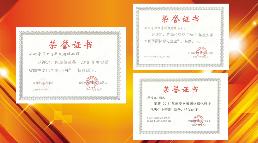 在舉國歡慶祖國70周年華誕之際,由安徽省園林行業協會主辦的2018年度安徽園林綠化行業評選落下帷幕,我公司榮獲“2018年度安徽省園林綠化企業50強”、“安徽省園林綠化優秀企業”,公司總經理張安斌先生獲“2018年度省優秀企業經理”榮譽稱號。