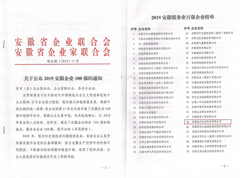 近日,安徽省企業聯合會、省企業家聯合會發布2019安徽企業100強名單,并首次完整發布了2019安徽服務業百強企業榜單和2019安徽制造業百強企業榜單名單。安徽海興生態科技有限公司榮獲“2019安徽服務業百強企業”,位列全省排名第44位。