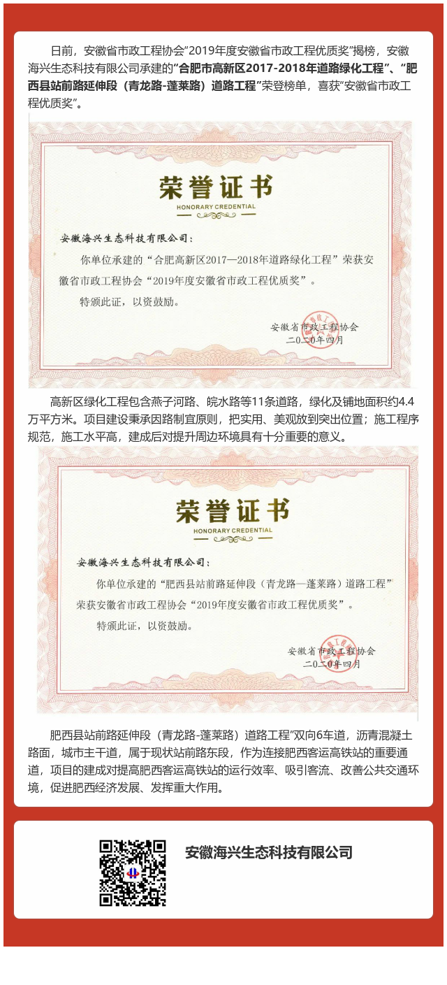 熱烈祝賀安徽海興生態科技有限公司獲“安徽省市政工程優質獎”