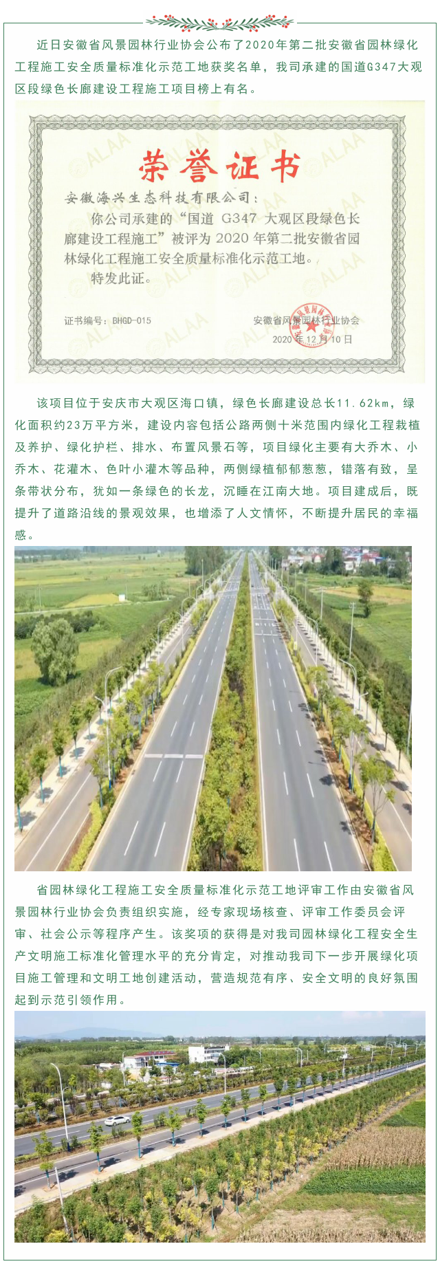 賀我司榮獲“安徽省園林綠化工程施工安全質量標準化示范工地”稱號